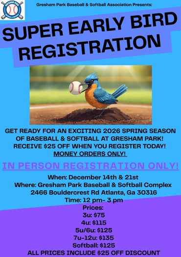 The team’s at Gresham Park are made up of passionate athletes and sports enthusiasts who understand the importance of mentoring and developing the youth. We're dedicated to helping the youth grow and prosper while being coached by the best coaches in Georgia! Our t-ball ages start from 3u-12u and our softball ages start from 3u-14u. Our Spring season is from April-June and our Fall ball season (which is registered per team and not individually) is from September- October.